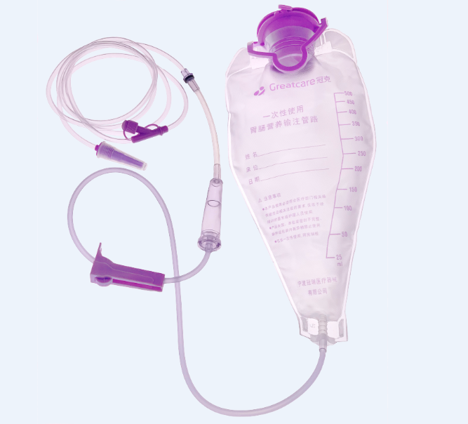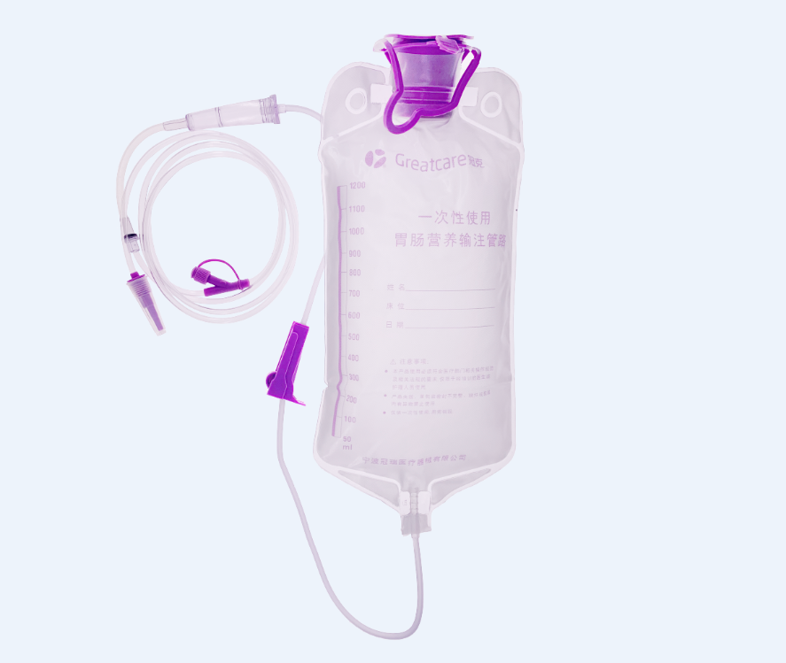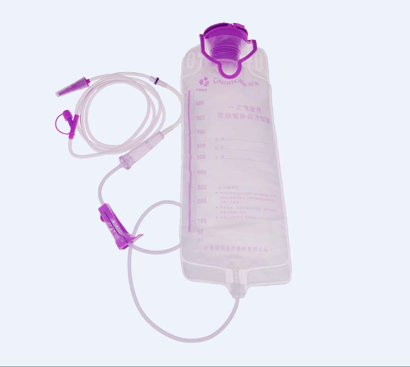 使用方法:袋式泵用型:1)打开包装,取出本品;2)关闭调节器,将营养液装入袋内,盖好盖子并将其悬挂在杆子上;3)将硅胶管部分连接到肠内营养泵上,根据使用人员情况设定流速(1-1200ml/h);4)取下保护帽,然后将出液接头连接到鼻饲管或胃管,启动喂食泵进行喂食;5)产品使用完毕,应按临床对医疗垃圾的处理规定进行处理。
